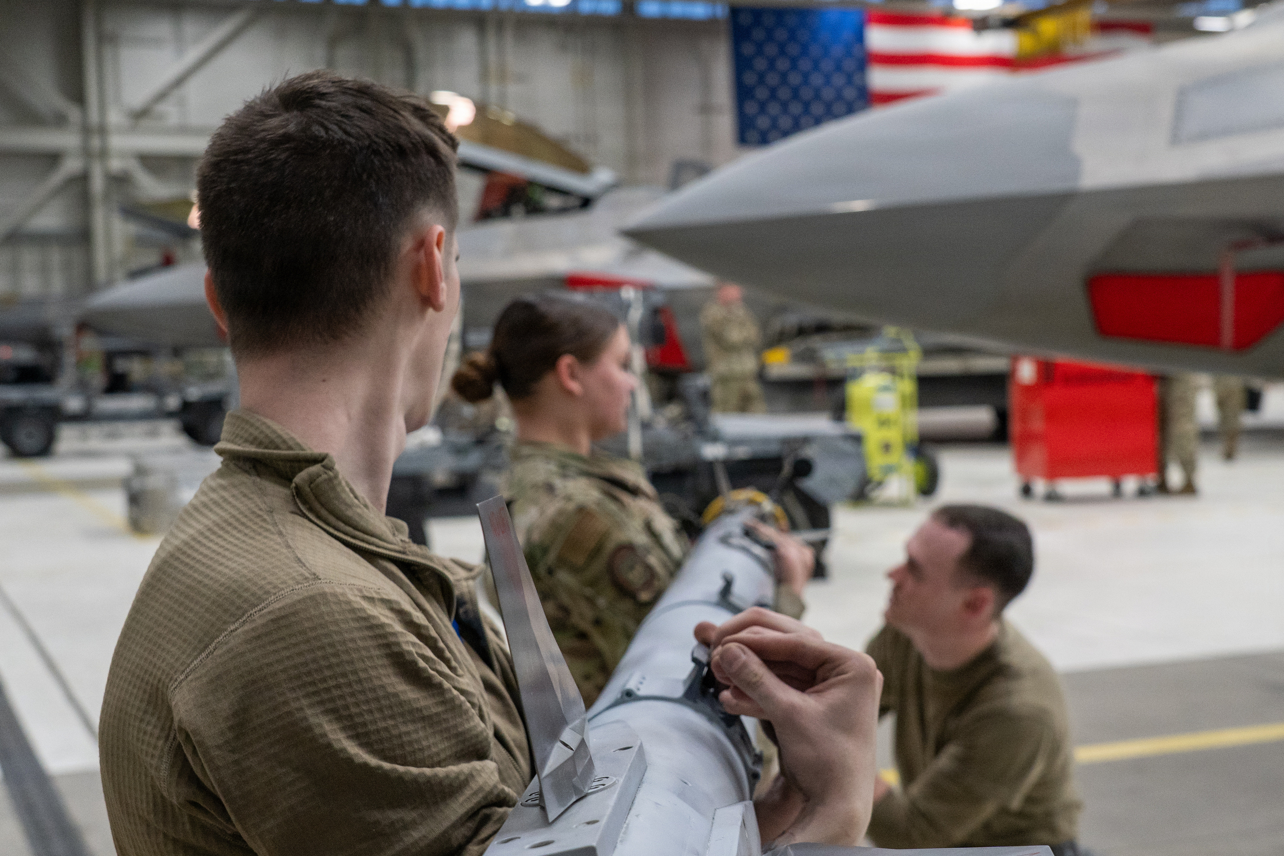 Spectators – both civilian and military – gathered at Hangar 25 as the stage was set for the bomb build and load competition. Among those in attendance was U.S. Air Force Senior Master Sgt. Andrew King, weapon standardization superintendent assigned to the 3rd Maintenance Group.