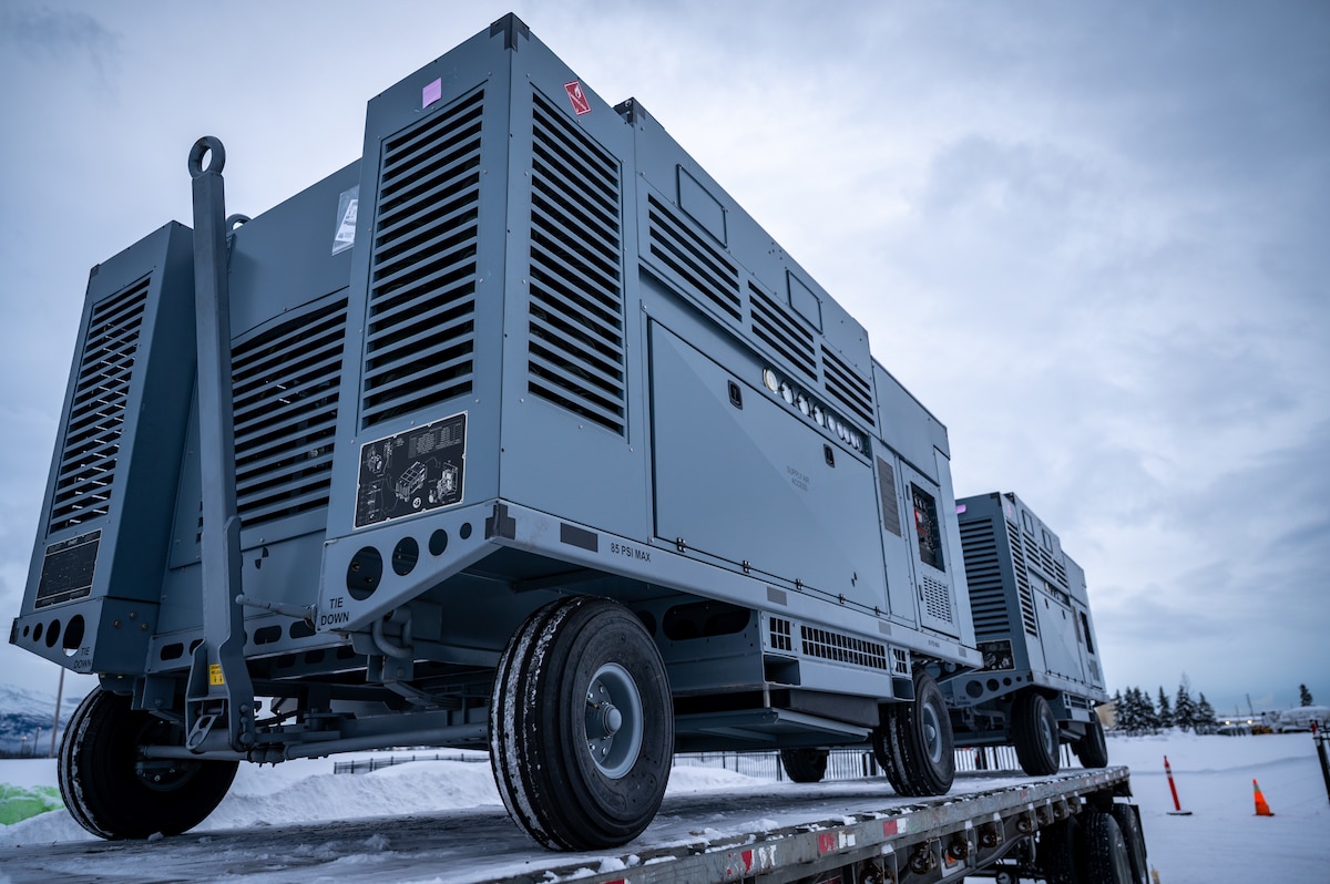 673d Logistics Readiness Squadron contractors, Xavier Strong, left, and Matt Regevig, clear snow from a trailer in order to load Prepositioned Warfighting Materiel at Joint Base Elmendorf-Richardson, Alaska, Jan. 15, 2026. The movement of PWM revamps Pacific Air Command's ability to rapidly generate airpower and provides the theater with enhanced infrastructure, robust material maintenance, and advanced command, control, communications, computers, and intelligence capabilities. (U.S. Air Force photo by Senior Airman Hunter Hites)