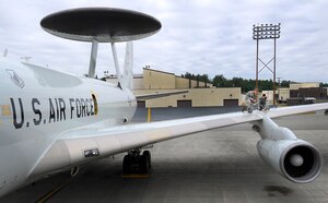 Senior Airmen Brandon Ansbro and Michael Dawson, both crew chiefs with the 703rd Aircraft Maintenance Squadron, perform an over wing inspection on an E-3 Sentry Airborne Warning and Control System assigned to the 962nd Airborne Air Control Squadron, July 2. Ansbro is from Missoula, Mont., and Dawson
