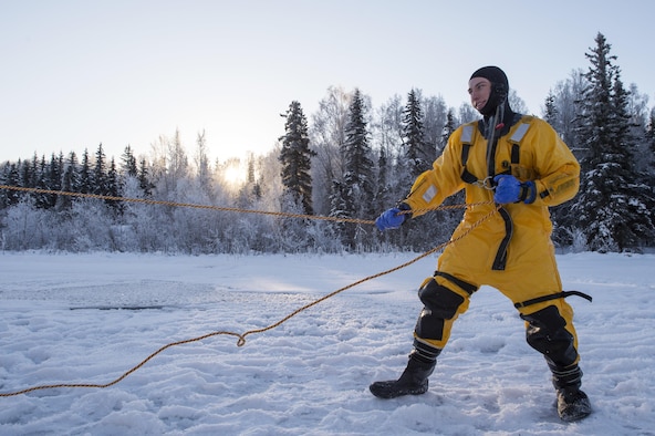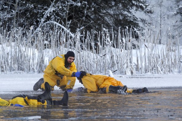Air Force firefighters, assigned to the 673d Civil Engineer Squadron, conduct ice water rescue training at Joint Base Elmendorf-Richardson, Alaska, Feb. 4, 2017. The training taught the JBER firefighters self-rescue techniques, victim recovery, and certified them as ice water rescue technicians. (U.S. Air Force photos/Alejandro Peña)
