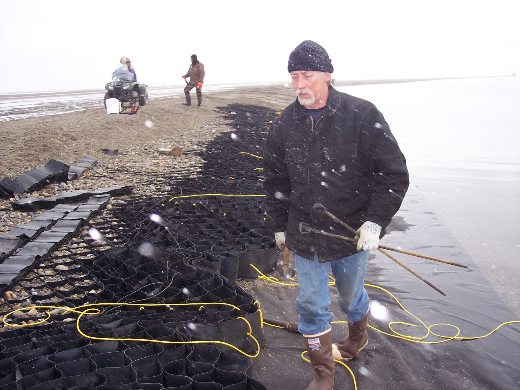 Dave Kerns, facilities maintenance specialist, left, and Denny Hodges, aerial tram specialist, inspect cable riggings prior to a 14 ton pull of the aerial tram at Cape Romanzof Long Range Radar Station. The tram connects the upper and lower camps. Both the tram and a road are used by the employees to access the upper camp depending on weather conditions and the work required.
