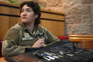 A U.S. Air Force F-22 Raptor assigned to the 3rd Wing takes flight during snowfall at Joint Base Elmendorf-Richardson, Alaska, Feb. 10, 2026. The F-22 Raptor is designed to project air dominance and cannot be matched by any known or projected fighter aircraft, providing power projection across the