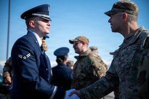 U.S. Air Force Airman 1st Class Kaden Hawley, a Joint Base Elmendorf-Richardson Honor Guard graduate, receives a congratulatory handshake from Col. Dustin Hansen, 673d Mission Support Group commander, during an honor guard graduation ceremony on JBER, Alaska, March 31, 2026. Airmen from a multitude