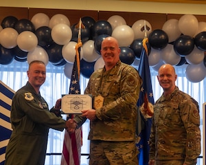 U.S. Air Force Tech Sgt. Andrea Bullard, Senior Non-Commisioned Officer inductee, recieves a plaque from the Joint Base Elmendorf-Richardson and 673d Air Base Wing leadership team during the SNCO induction ceremony at the Dena'ina Center in Anchorage, Alaska, Oct. 24, 2025. This annual event brings